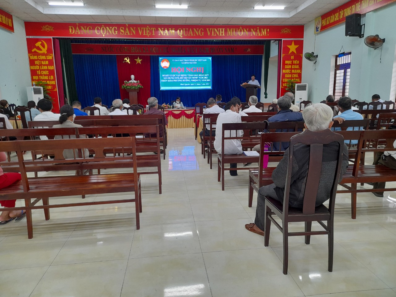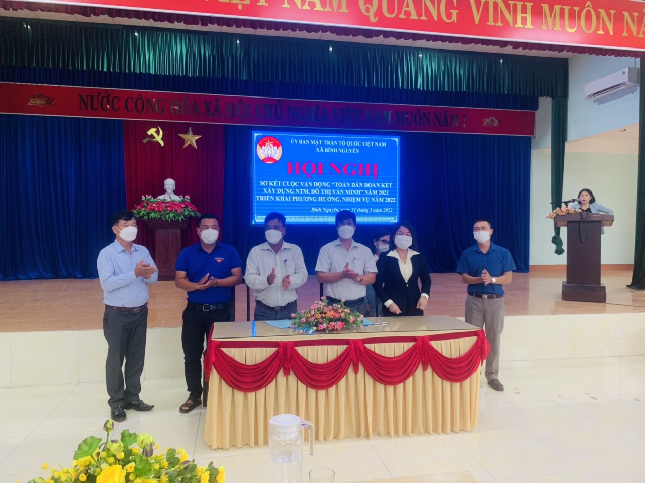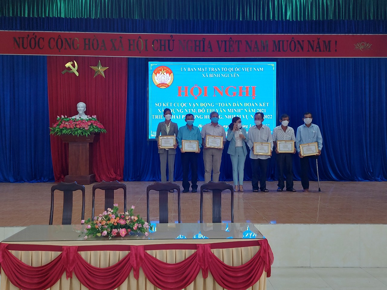 Vào sáng ngày 31/3/2022, Ủy ban MTTQ Việt Nam xã Bình Nguyên tổ chức Hội nghị sơ kết cuộc vận động " Toàn dân đoàn kết xây dựng NTM, đô thị văn minh"; triển khai nhiệm vụ năm 2022 đồng thời biểu dương, khen thưởng các tập thể cá nhân tiêu biểu thực hiện tốt cuộc vận động. Đến dự Hội nghị có đại biểu lãnh đạo BTV Đảng uỷ; Thường trực HĐND; lãnh đạo UBND; đại biểu các ban ngành, hội, đoàn thể; Bí thư chi bộ, Trưởng thôn, Trưởng Ban CTMT; đại diện Tộc văn hóa và các tập thể, cá nhân được khen thưởng.