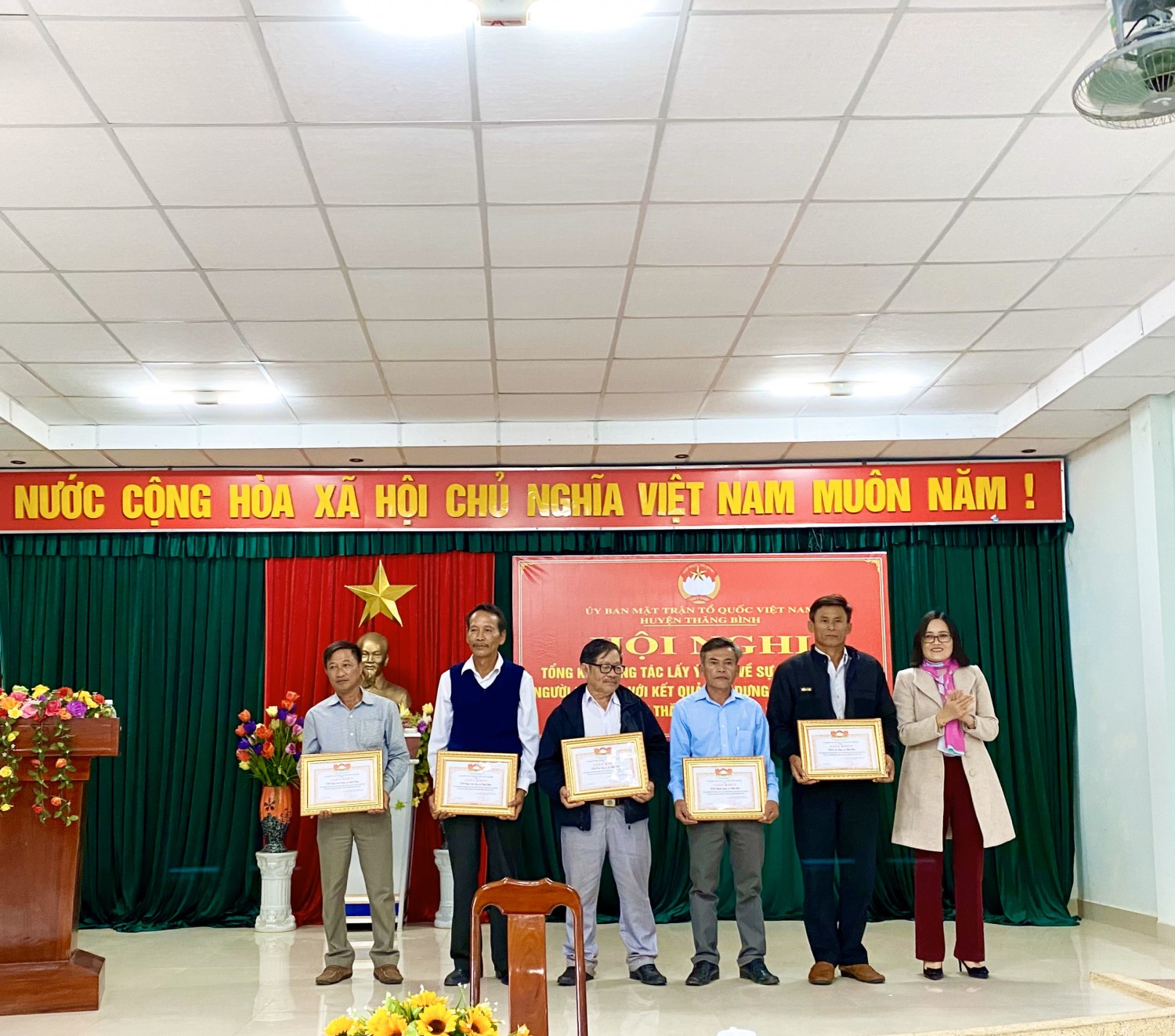 Đồng chí Phan Thị Nhi - UVBTV, Chủ tịch UBMTTQVN huyện trao giấy khen cho các tập thể