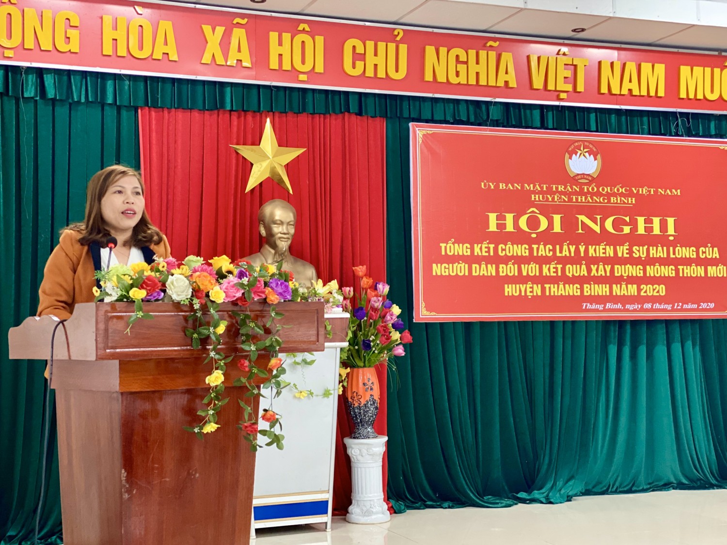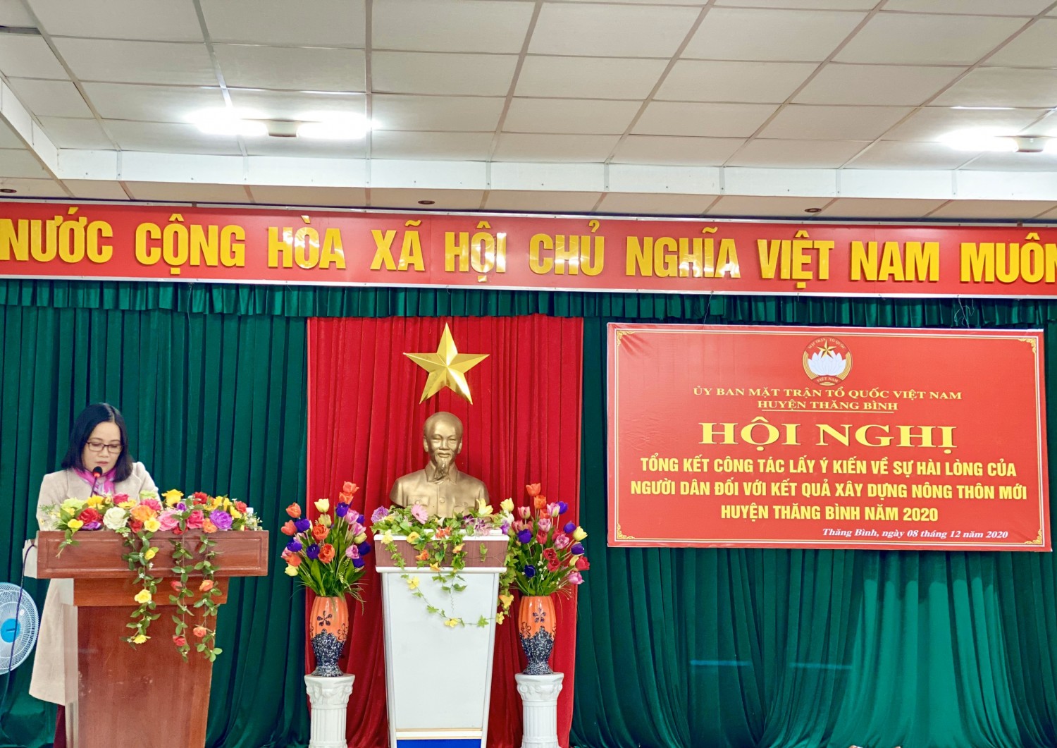 Năm 2020, huyện Thăng Bình có 03 xã: Bình Đào, Bình Phục và Bình Hải đăng ký về đích nông thôn mới. Ngay từ đầu năm, Ban Thường trực Ủy ban MTTQ Việt Nam huyện xây dựng kế hoạch tổ chức tuyên truyền và tập tập huấn triển khai các nội dung của Đề án 04, hướng dẫn quy trình lấy ý kiến đánh giá sự hài lòng của người dân đối với kết quả xây dựng nông thôn mới tại 03 xã nêu trên. Đến ngày 15/9/2020, sau khi nhận Báo cáo thẩm tra kết quả từng tiêu chí và công văn đề nghị tiến hành lấy ý kiến của người dân về kết quả xây dựng nông thôn mới tại 03 xã của Ủy ban nhân dân huyện, Ban Thường trực Ủy ban MTTQ Việt Nam huyện đã xây dựng kế hoạch và tổ chức Hội nghị lấy ý kiến tại 12 khu dân cư của 03 xã theo đúng quy trình.